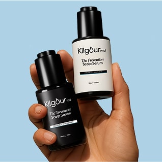 The KilgourMD Dual-Action System is designed to address these triggers, reducing the visible effects of 5-α reductase, calming inflammation, and supporting scalp health while rejuvenating growth.