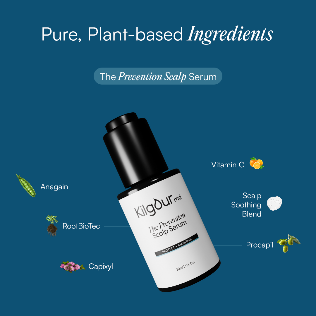 The KilgourMD Dual-Action System is designed to address these triggers, reducing the visible effects of 5-α reductase, calming inflammation, and supporting scalp health while rejuvenating growth.